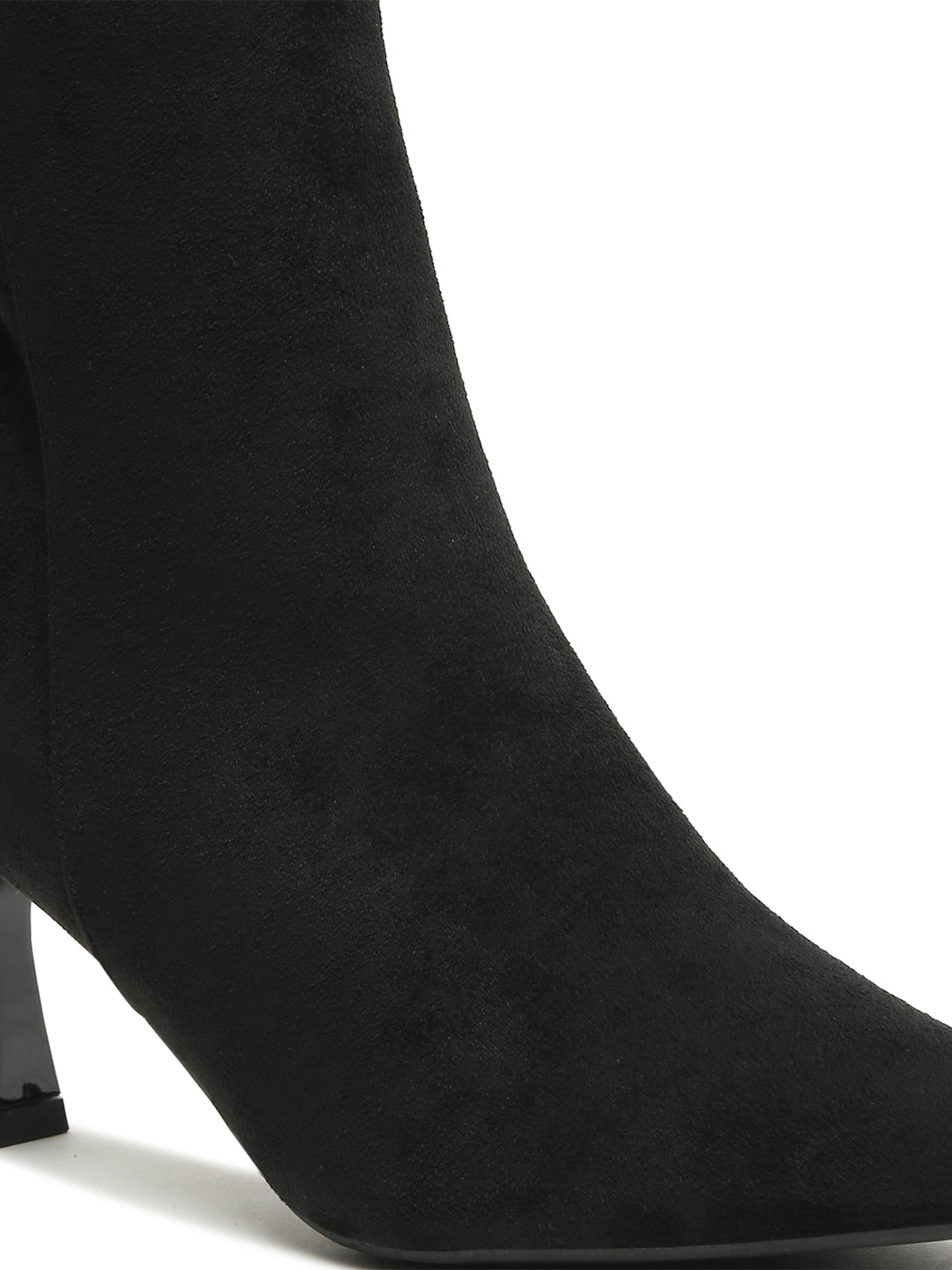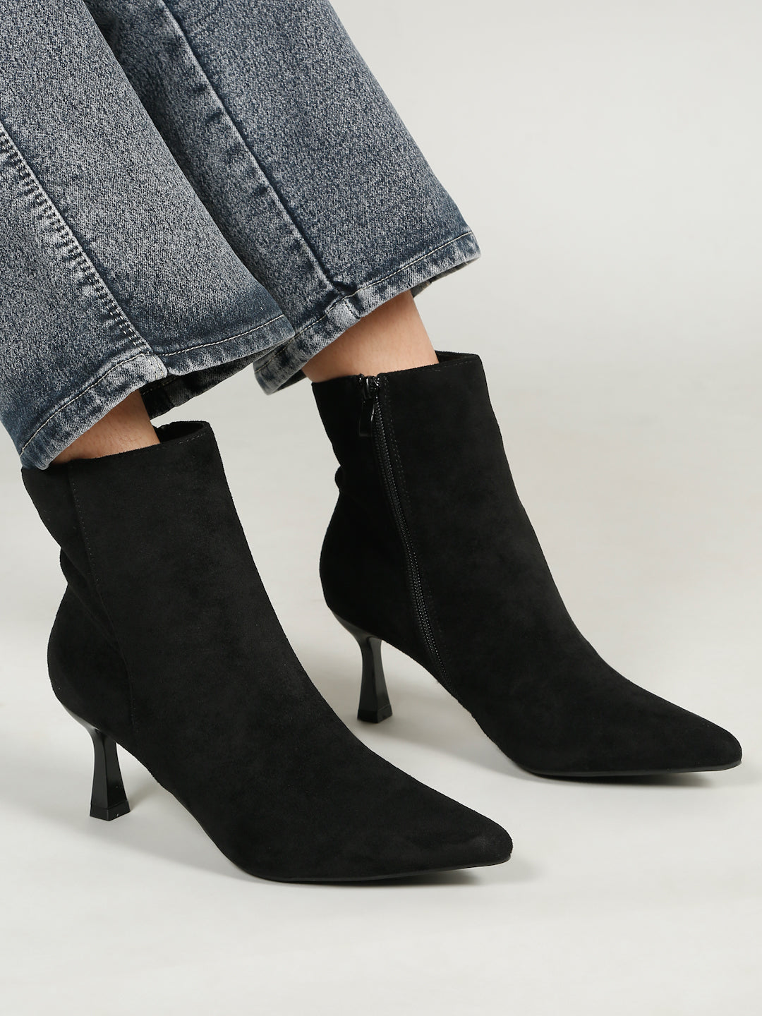 • A pair of Black Boots has Zipper with Pointed Toe.