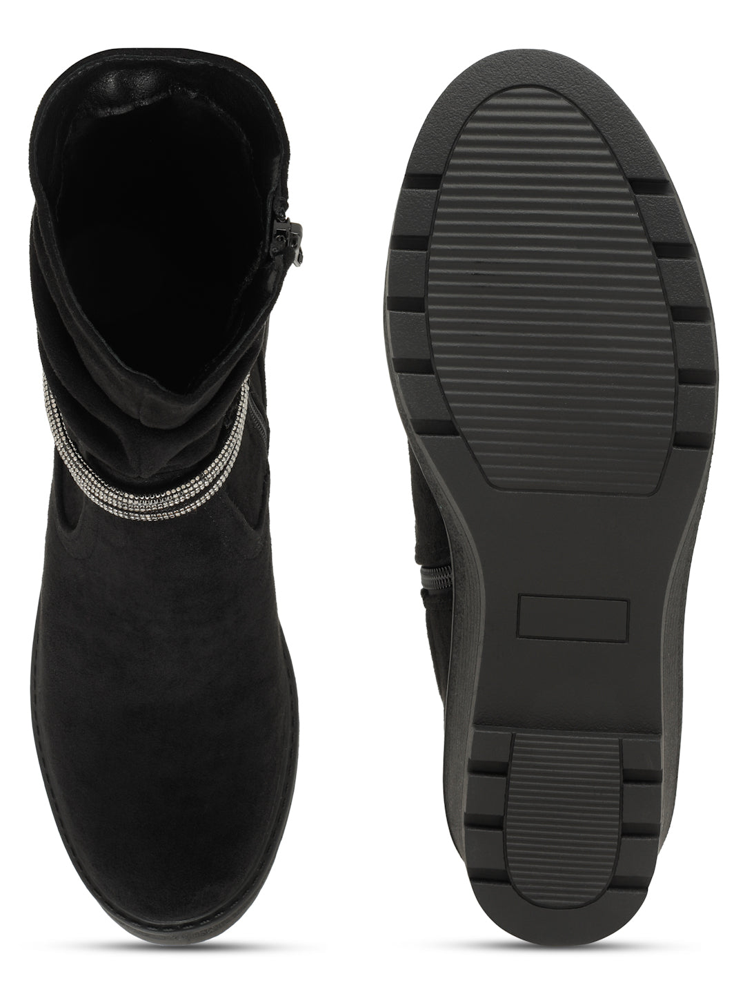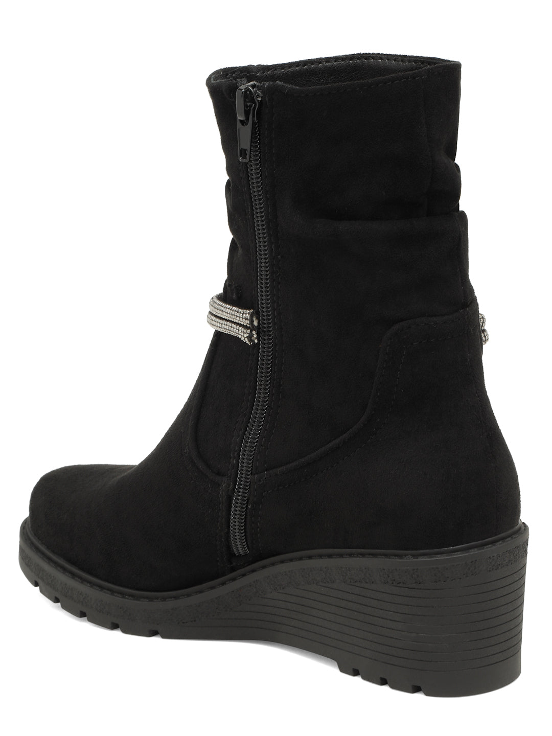 • A pair of Black Boots has Zipper with Round Toe.