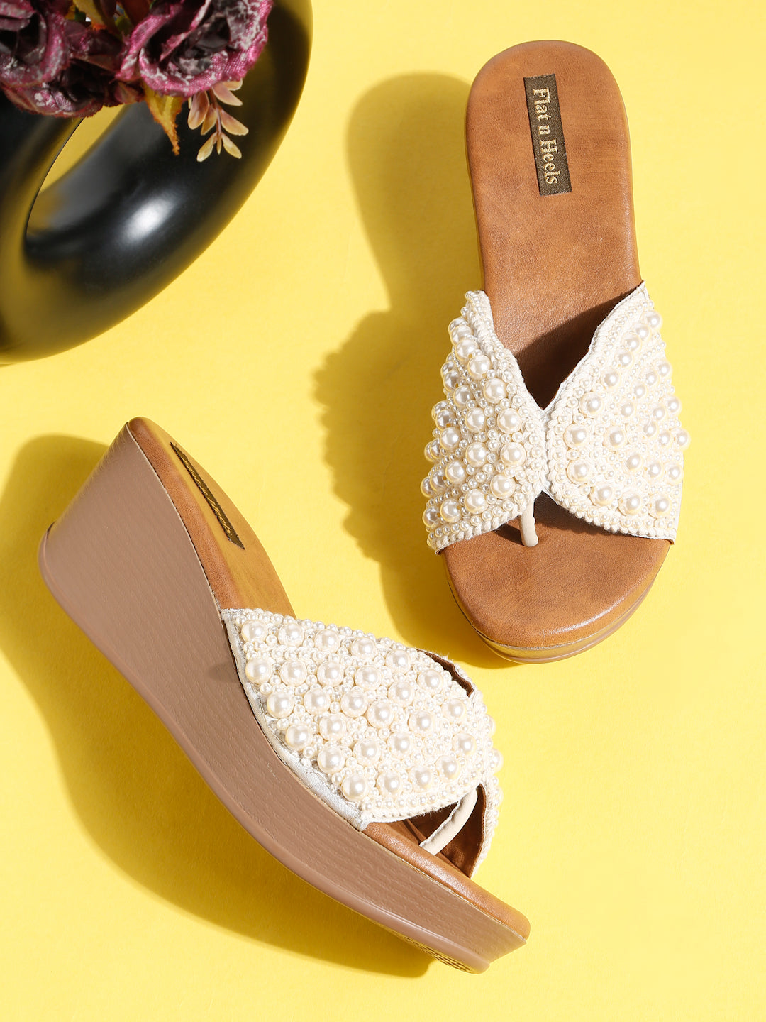 • A pair of Beige Pumps has Slip on with Open Toe.